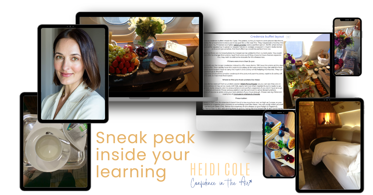 ✔ Many find this part of the role tricky as there are so many variables, and it’s completely different to commercial flying. Here, you’ll learn practical tools, resources, and simple frameworks to help you do it well and make life easier for yourself. You’ll discover how to stay ten steps ahead, reduce stress, and focus more on being present in the cabin rather than getting caught up in catering challenges before and during the service. This includes everything from pre-flight preparation to getting ready for your next trip with ease and confidence.