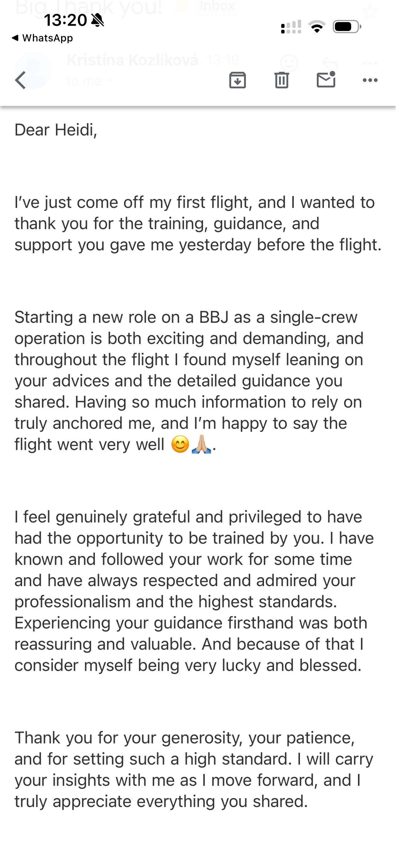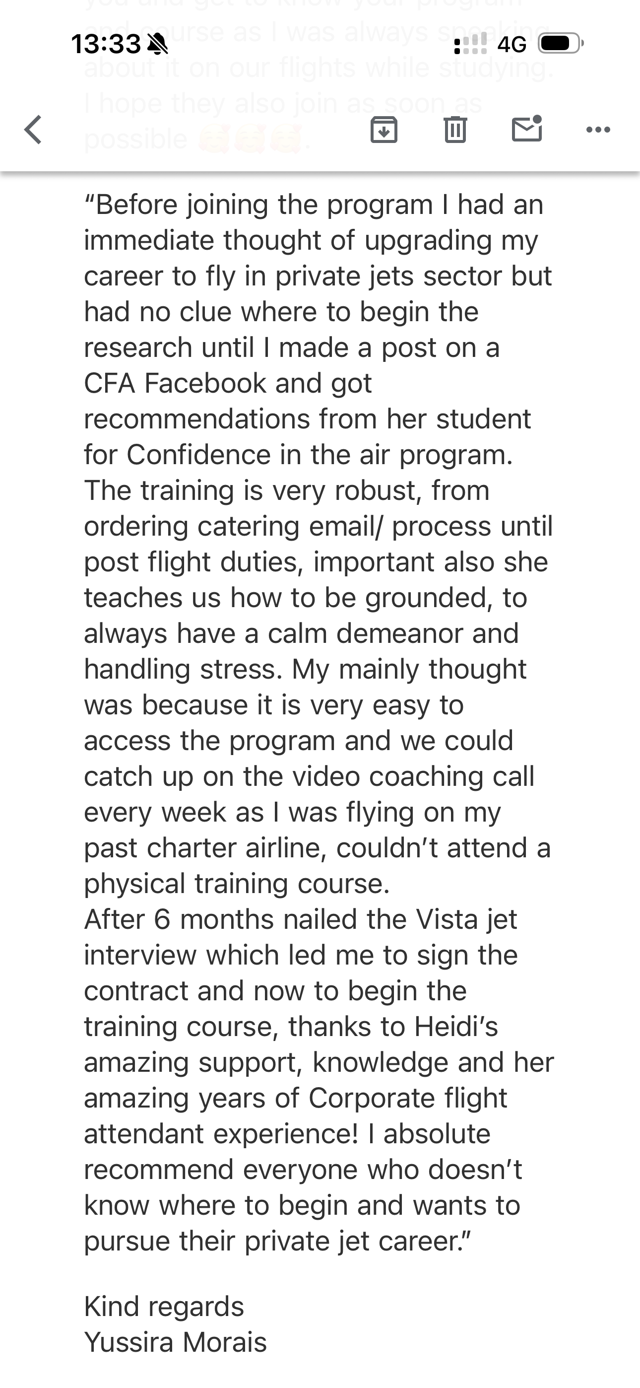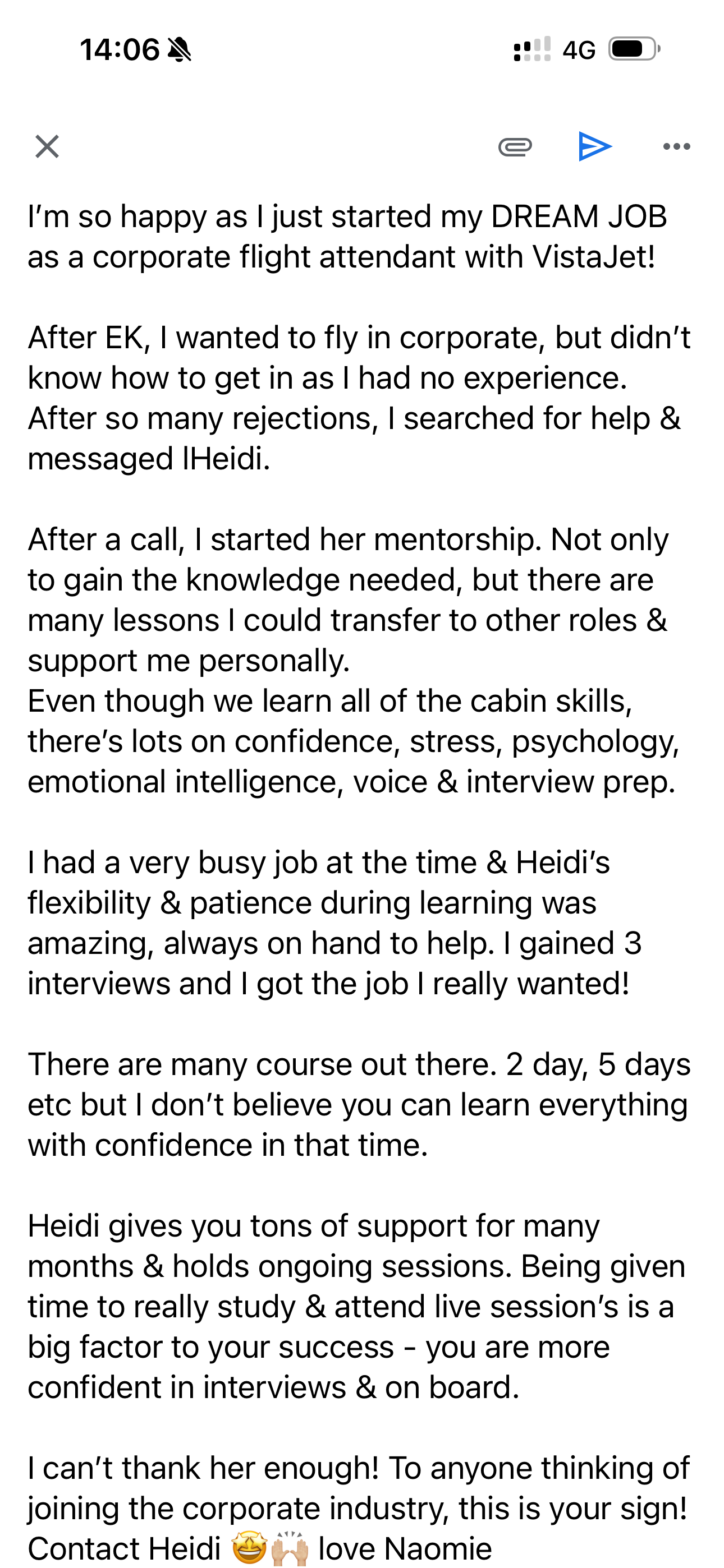 “Heidi really changed the trajectory of my career. I struggled with confidence but she wouldn't give up on me. After much learning with her, I nailed the 3rd interview and now have a role as a Corporate Flight Attendant where I feel really valued. "